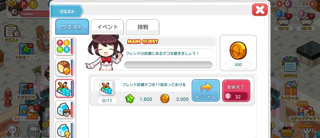 画面左にある「ミッション」を確認してそれを目標に進めていけばOKです。簡単なミッションから進めていけばOK。ただし、フレンド関係のミッションが多くあることは注意が必要です。例えば「フレンドの店舗にあるデコを磨きましょう!」というミッションがあるのですが、磨けるデコがなければ達成できません。つまり、フレンドのところで何かお手伝いをするのはミッションに発生しているものだけにして、残しておくことが必要になるのです。