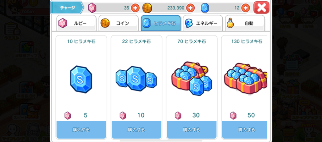 ヒラメキ石を使用して商品をパワーアップすることができます。ミッションに出てくるので、ミッションに出てきたものを開発していくといいでしょう。ただし、ヒラメキ石が足りなくなります。ヒラメキ石の入手方法は少なく、おすすめはルビーで購入です。