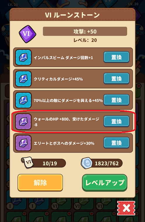 「ウォールのHP+800、受けたダメージー8」これが明らかに強い。雑魚の攻撃が全然効かなくなり、ウォールに敵が大量密集しても何とかなることが増えます。ルーンストーンは種類がありすぎて迷ってしまうと思いますが、これはセットしましょう。