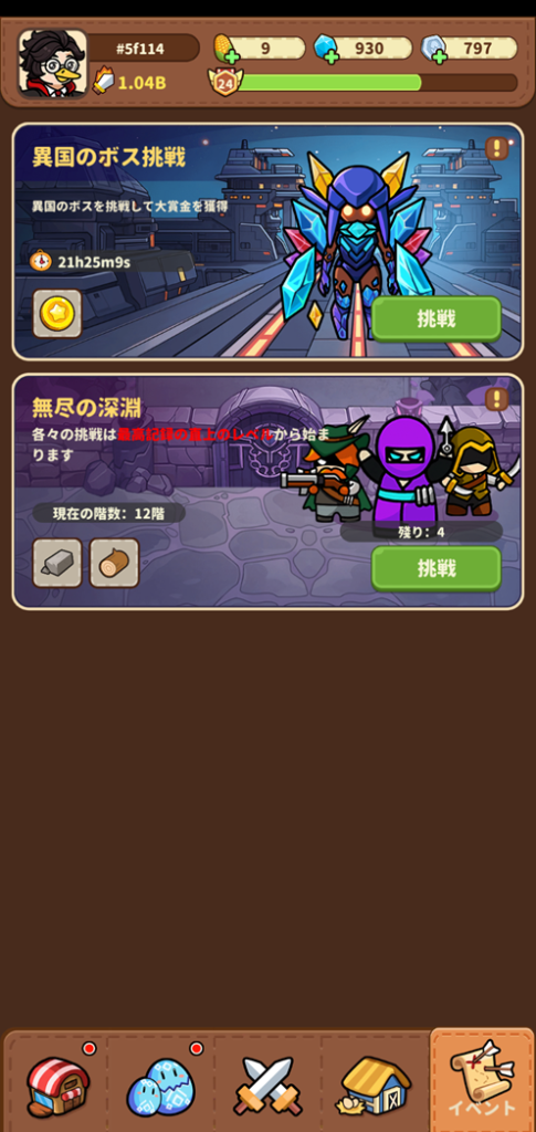 メインが画面の一番右下にイベントステージがあります。挑戦回数が決まっているためすべて使い切りましょう。コーンは消費しません。ただ時間がかかる。特に無尽の深淵の方は引くほど時間がかかる。